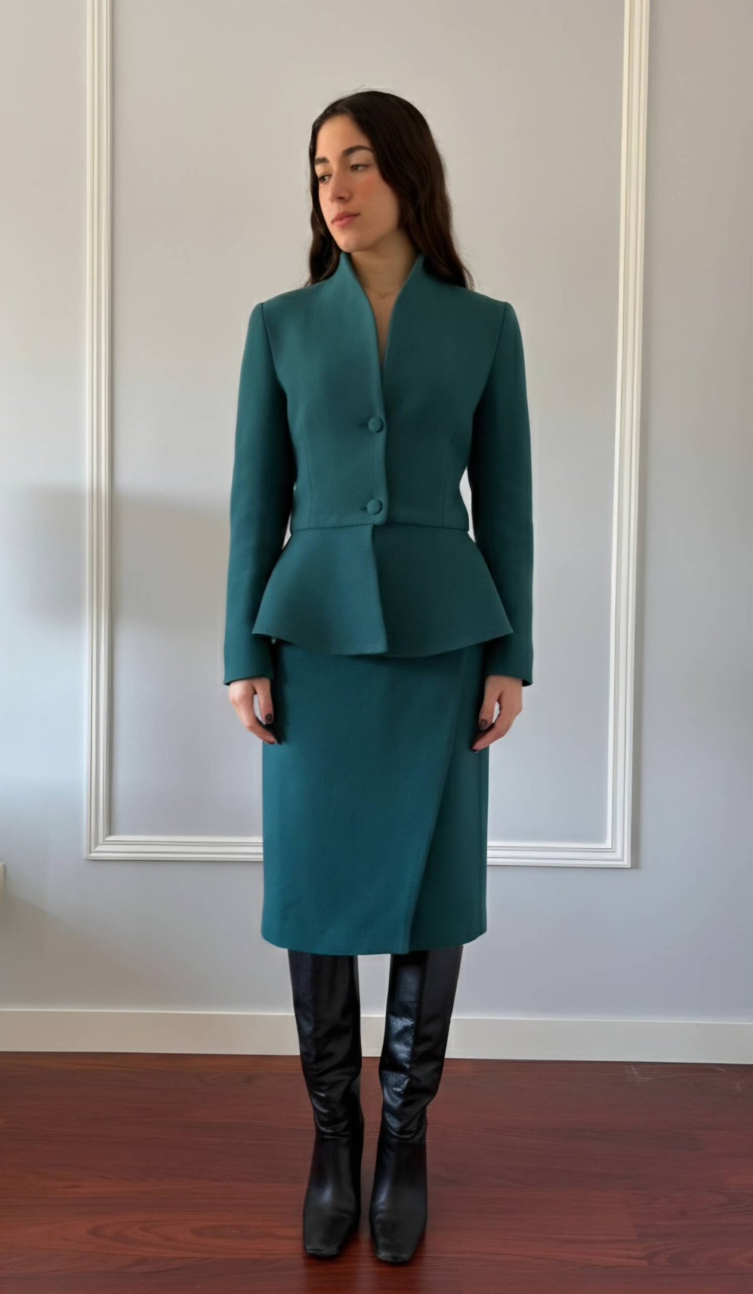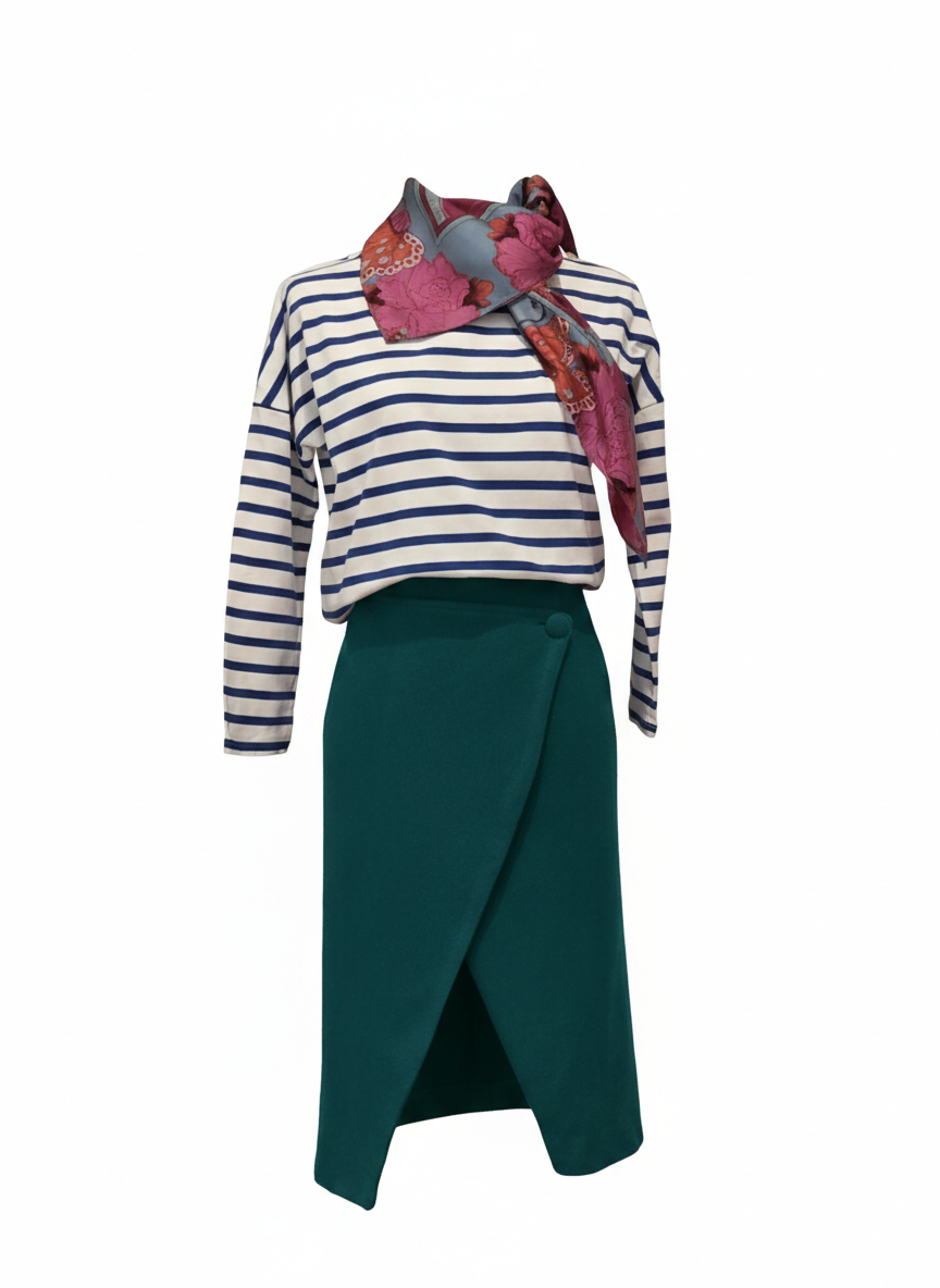 Falda midi cruzada recta con ligera asimetría.